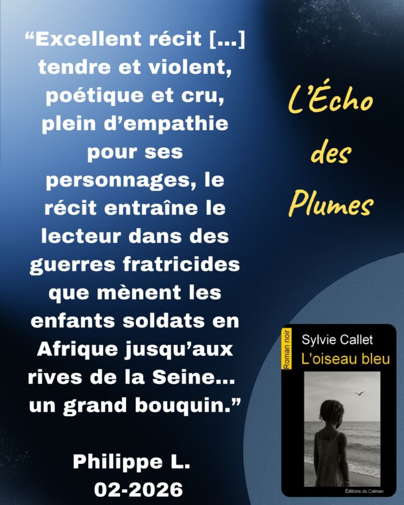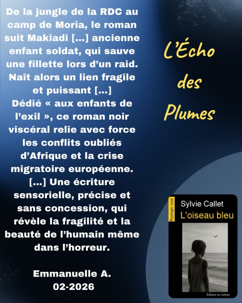 De la région de Goma à l’île de Lesbos jusqu’à Paris, « L’oiseau bleu » nous offre un miroir bien plus puissant que celui de l’autofiction. Plus puissant parce que plus enrichissant, plus fidèle, plus perturbant aussi. Il faut s’ouvrir à l’autre, aux autres, pour faire partie du monde et faire société. Cela peut commencer par une chorale, mais cela demeure une affaire de gouvernance et de politiques. Même au pluriel, le gros mot est lâché – politique – mais il est intrinsèque au terrain littéraire dans lequel navigue Sylvie Callet et qui se nomme « roman noir ». Il existe dans notre monde des causes autres que psychologiques ; des contextes autres qu’immuables ; des solutions collectives.